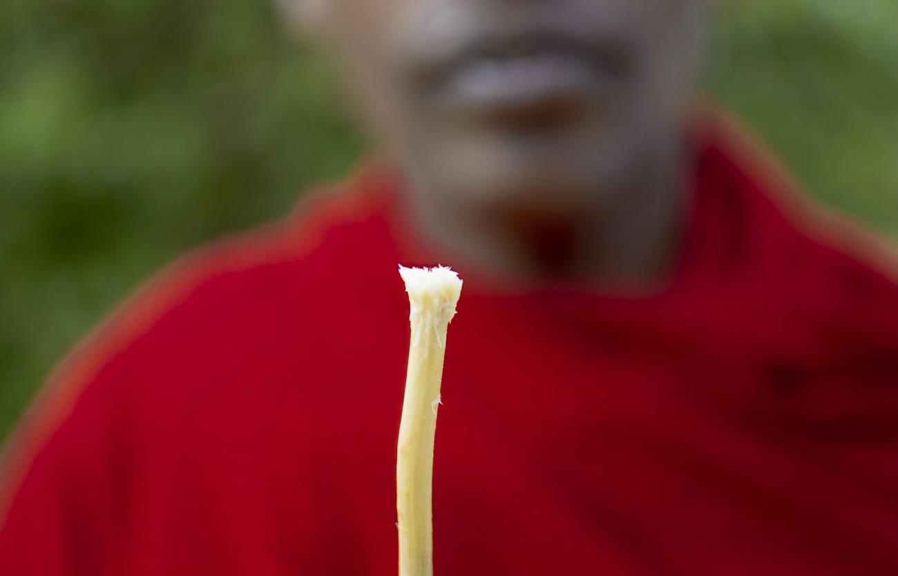 Maybe if they tried spitting straight up, they’d eventually reach space. Since they spit very often, there would soon be a lot of Maasai saliva in orbit, and it could be used as satellite internet. And since Starlink isn’t allowed in Tanzania, they could have their own Maasai saliva-based internet. So, how do you prepare such a toothbrush branch? You find a suitable bush, esiteti, pull out a machete, and try to look inconspicuous. Then you launch into a short, almost always victorious fight with the bush and walk away smiling with a reasonably thick twig, moving far enough away so the bush can’t take revenge. You strip the bark off the twig with the machete, chop the end off nice and straight, and split it into fibers using your back teeth. Depending on how long you chew, you can define the hardness of the toothbrush bush: soft, medium, or hard. Once the bush has calmed down and the twig is sufficiently chewed, you stick it in your mouth and clean your teeth. You often wander around while doing it, pretending you’re doing some serious work.