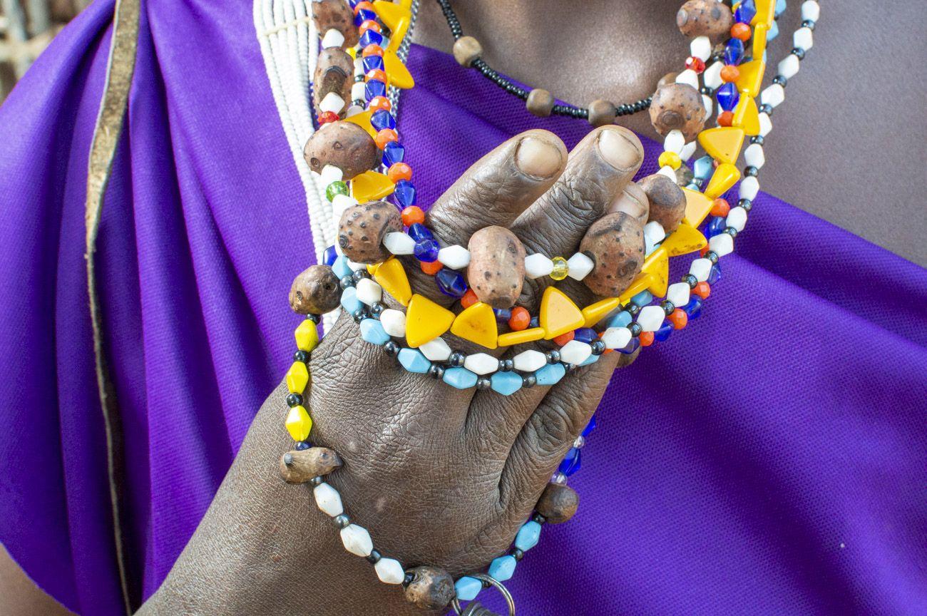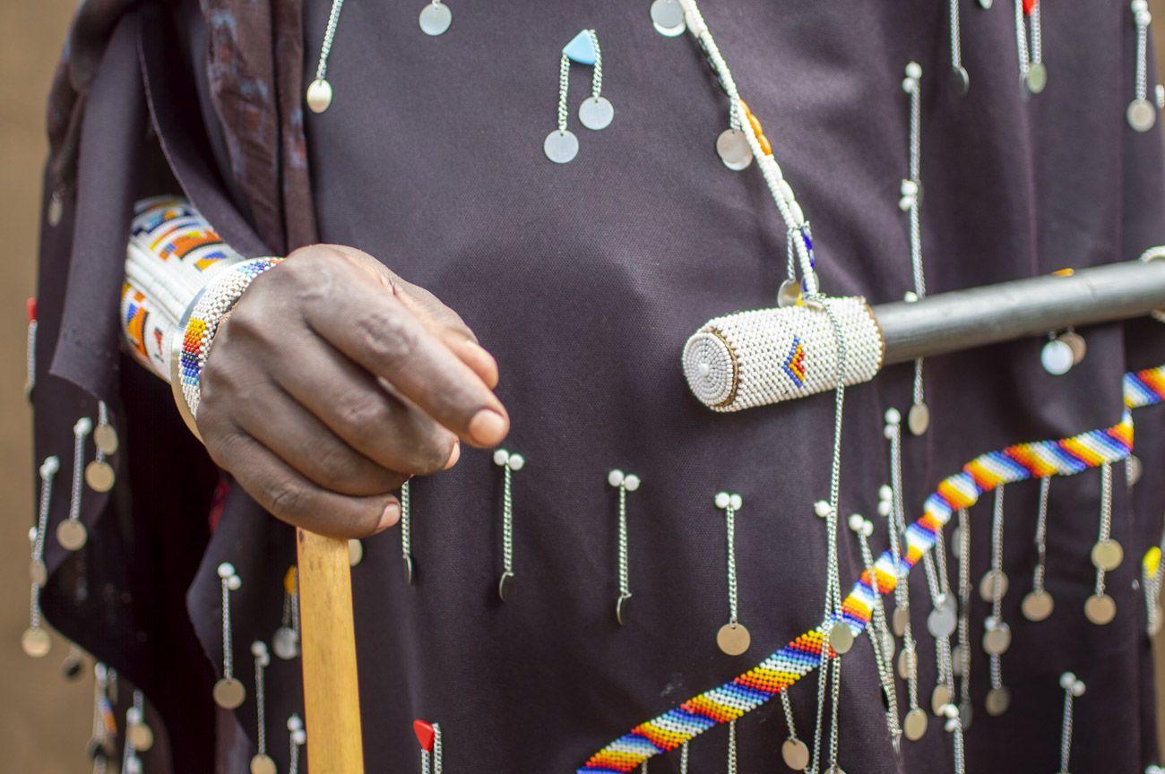 Seeing a Maasai warrior on a regular weekday without beads in every color known to humanity means he is not a Maasai warrior. Their affection for bracelets, necklaces and ornaments sometimes borders on fanaticism. Fanatics of all nations, unite—and hang yourselves in beads! My favorites were the emusitai—wide bracelets, about twenty centimeters across, worn on the forearm. They were expensive, handmade, each one unique. The funniest part? They were sewn on permanently, so they couldn’t be taken off. Another very popular decoration were small metal discs with a hole. If they were coins, there would have to be a Maasai National Bank issuing small change before every celebration so people would have something to decorate themselves with. But there is no Maasai National Bank—if only because it would have no authority to declare national mourning in case the coins ran out.