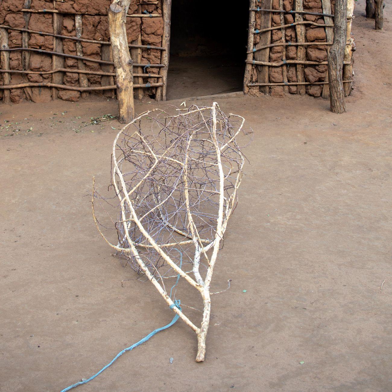 Traditional Maasai houses in a boma (a homestead typically consisting of a few family huts plus enclosures for cows and goats) look a bit different. They start by setting up a frame made from what they call “thicker” trees—though in their case, “thicker” means trunks about 5 centimeters in diameter. Then they weave thinner shrubs horizontally through these upright posts, creating a kind of basket. Into that “basket,” they toss some mud, and presto, the house is complete. They end up with a sort of woven basket, pack it with mud, and voilà—instant home. The roof is made of shrubbery but covered with a thick plastic tarp—something like the canvas used on cargo trucks.