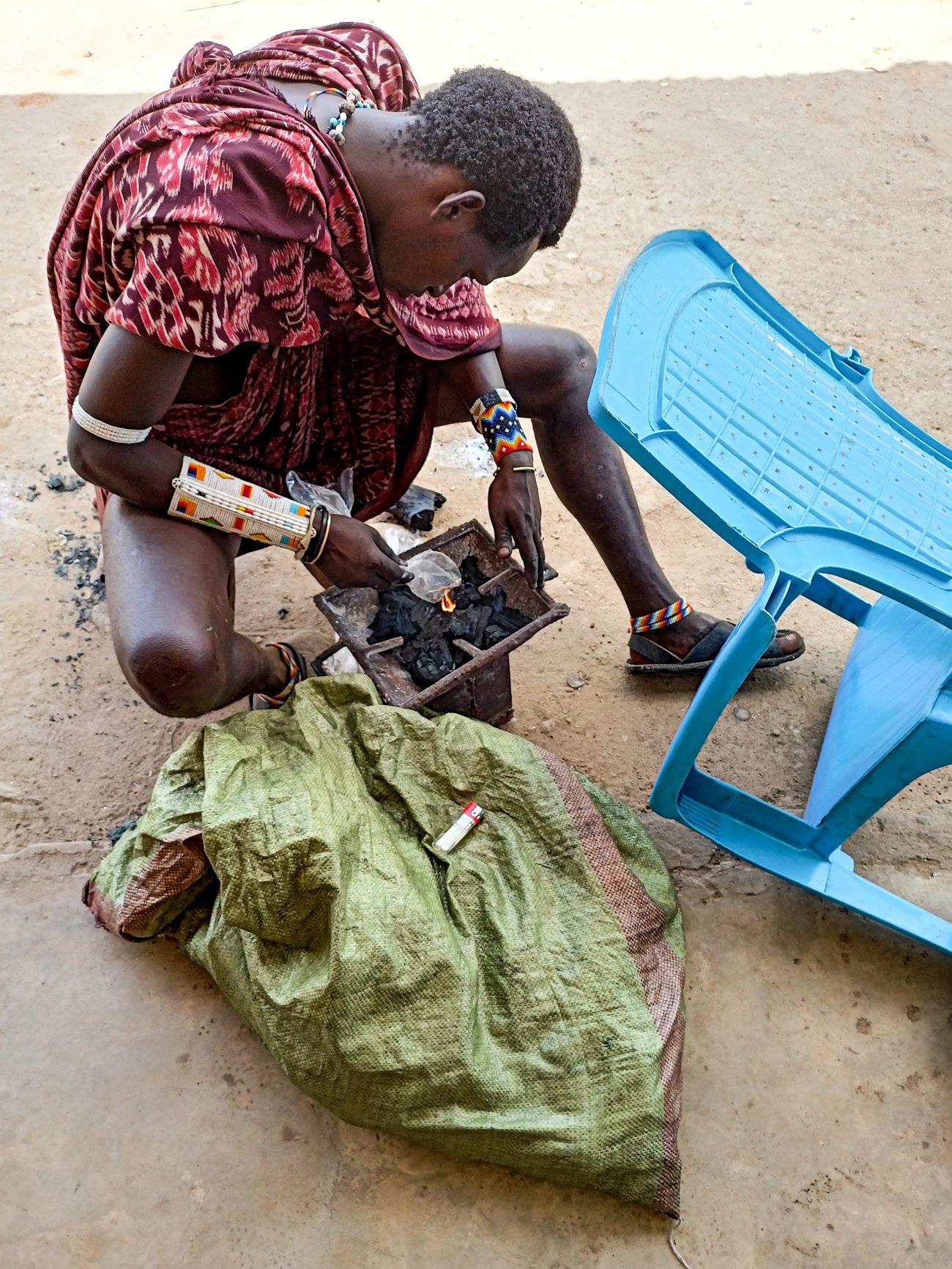 This is the magical place where the djiko creates a perfect right angle with the earth, the house, the sky, the sun, and, naturally, a passing donkey. The Maasai look at this in confusion, unable to understand what difference the djiko’s position now makes in comparison with the one before.. The whole situation reminds me of a computer game where you carry various items from one place to another, only to have a giant rock fall on your head and kill you in the end. And you still don’t understand why. The djiko isn’t lit yet. The next step is to get it burning. For this, a thick, sturdy plastic bag is used. You light it, and fiery drops start dripping onto the charcoal below. The drops keep falling until the plastic is entirely consumed. The smell of burning plastic spreads everywhere, and the charcoal begins to smolder gently.