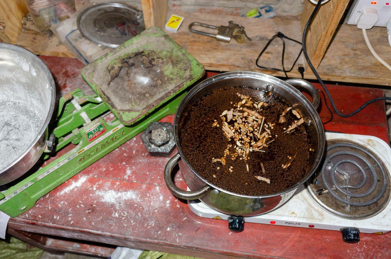 So now we have Sekenoi, charcoal, the djiko, Renča, and me, though I still have no idea what purpose I serve here. Pouring charcoal into the stove and crushing it slightly is no problem at all. It’s a moment of tension: the djiko is placed outside to avoid the smell indoors, but with no flat ground around, it has to be balanced just right to keep the tea pot steady. The tension stems from Sekenoi’s firm belief that the djiko is steady, contrasted with Renča’s certainty that it’s so off-kilter it will take both the stove and the pot down with it. To me, the whole thing is pure fun, and I can’t help but throw in a bit more fuel to the fire.
