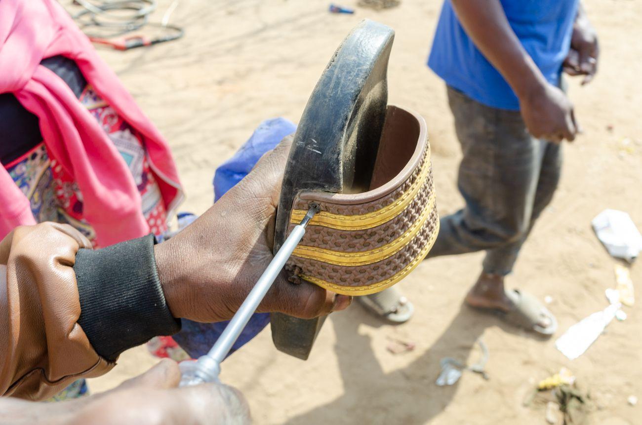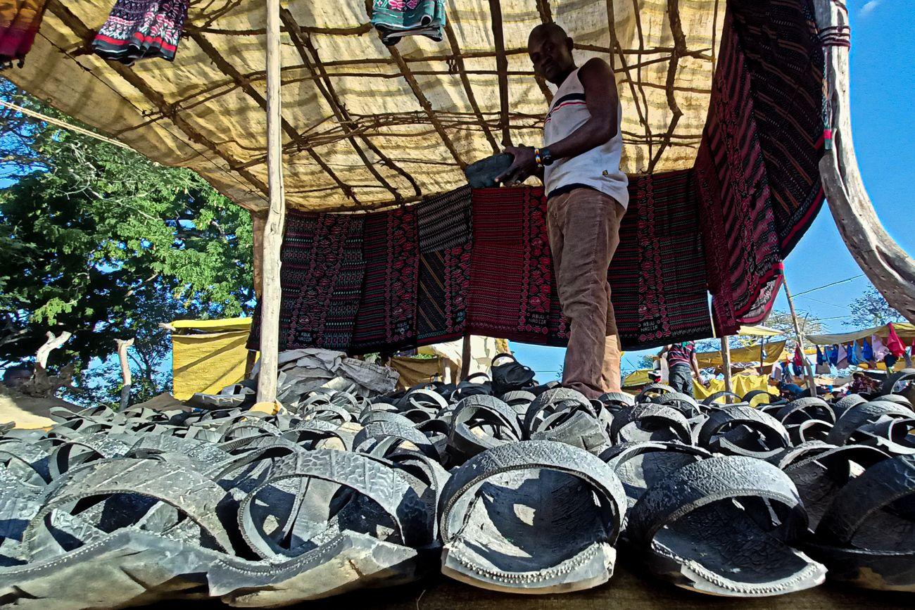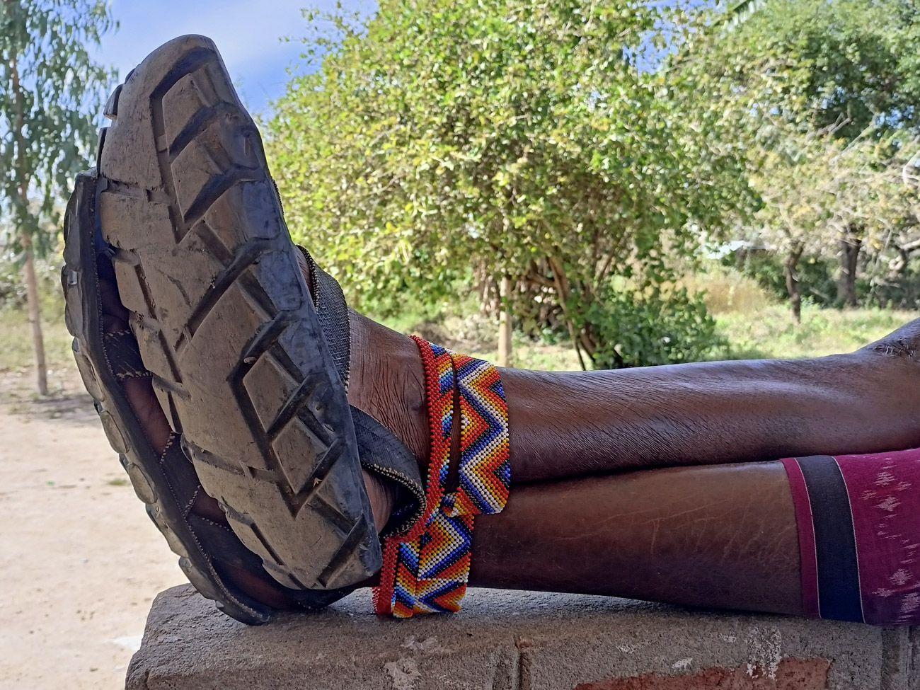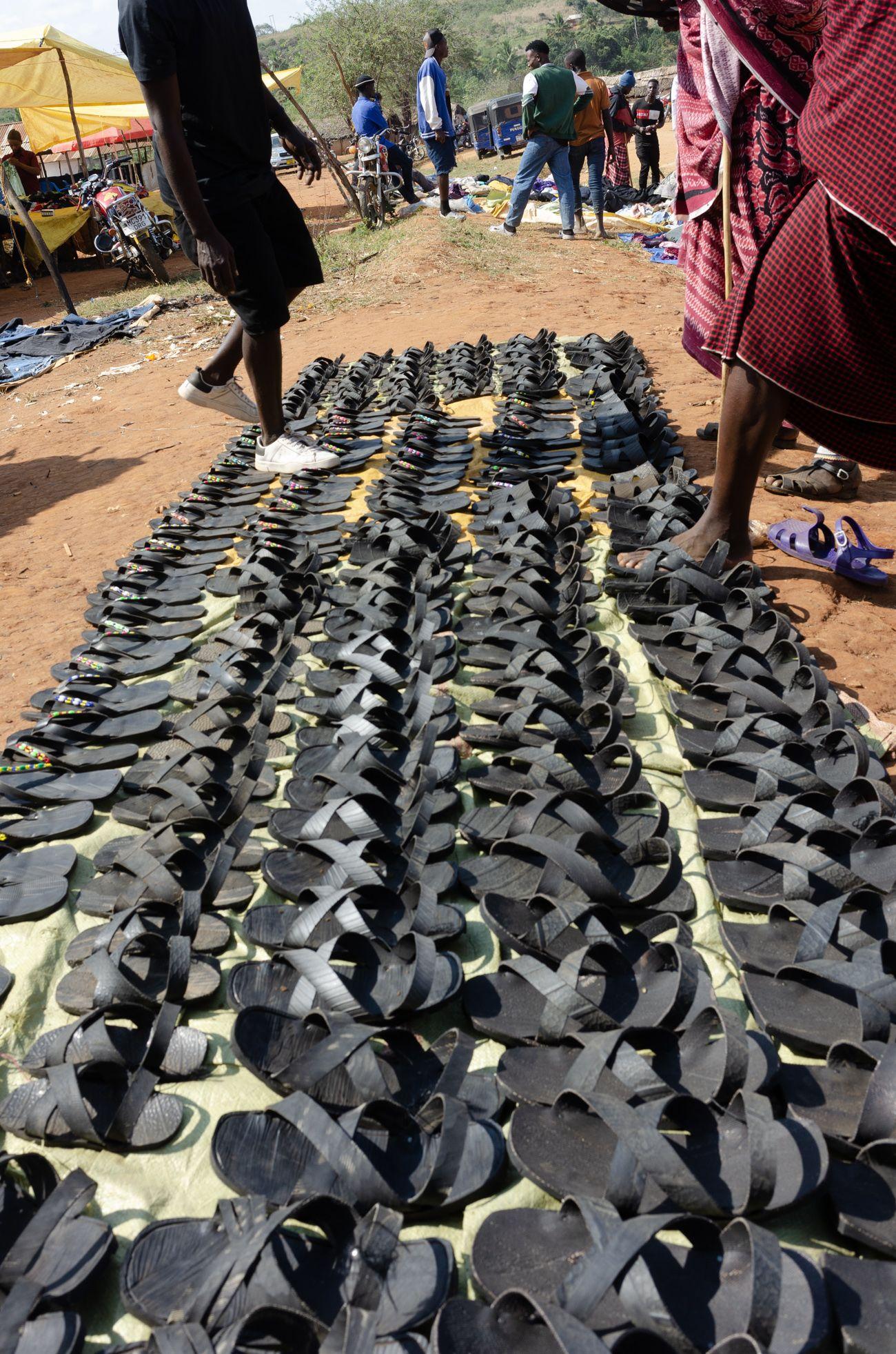 In Mbogoi, cars rarely make an appearance. Every Thursday, a few trucks arrive, bringing goods and vendors for the market. Occasionally, a passenger car shows up, but the potholes on the road make it quite the challenge to get here. That’s why all the Maasai wear sandals made from old car tires—to give the road and bush the impression that there are plenty of cars around. These shoes are crafted by a local artisan and can be bought at the market, where the selection is... colorful. “Colorful” in quotation marks, because they’re all gray. It’s more of a “gray selection,” but at least there are different sizes.